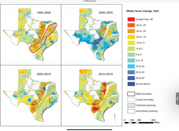 According to a Texas Aquifer Study from 2016 the picture showing the state of Texas and various aquifers has the Carrizo Aquifer outlined in red.  The illustration was taken from the Texas Water District Board.  Note: This study is 10 years old and the timeframe from 2010-2015 shows a severe depletion in water at the Texas-Mexico border where there are a lot of farming communities.  There is great concern that with our current drought conditions and massive amounts of new developments, there is not sufficient “recharge” (water going back into the aquifer) to sustain the aquifer at current levels.  At some point aquifers will have a finite end.  For example, in Tehran, Iran they have several aquifers which have run dry and there is not enough water to supply the millions of people living there.  There is talk about moving the city of Tehran where there is a water supply.  How this will happen is anyone’s guess.  Many people don’t want Texas to become the next Iran.