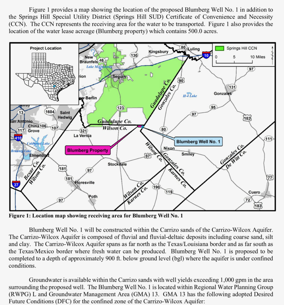 In short, the Springs Hill application is two parts: 1) to drill the well to be able to pump 2.86 million gallons per day from the Carrizo Aquifer and, 2) to transport the water to Guadalupe County.  Although they claim “residents in Wilson County will benefit” from this well, take a look at the map.  It appears there would be very few residents benefitting and most beneficiaries will be residents of Guadalupe County.  To many people this smells like greedy developers trying to supply much needed water to future developments in Guadalupe County.